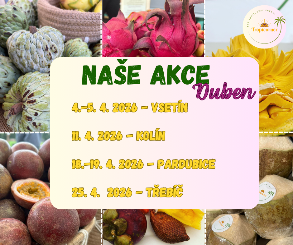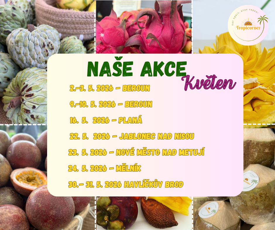 Dodávka exotického ovoce přiletěla přesně načas, a tak zákazníci mohou vychutnat čerstvé a chutné plody ze vzdálených tropických zemí. Kde nás najdete? V dubnu a v květnu se chystáme do těchto měst! Nemáte to blízko? Nevadí! Ovoce Vám zašleme až domů!